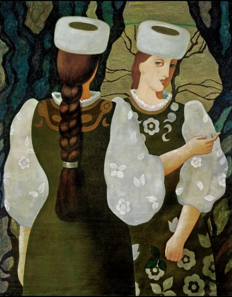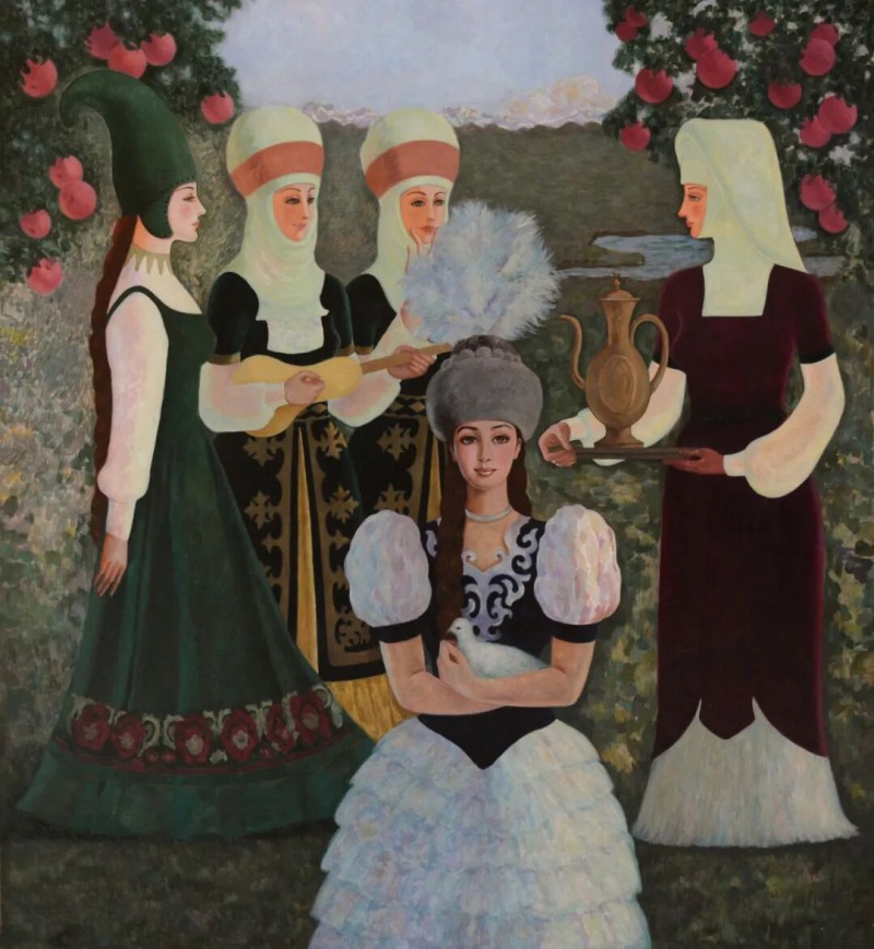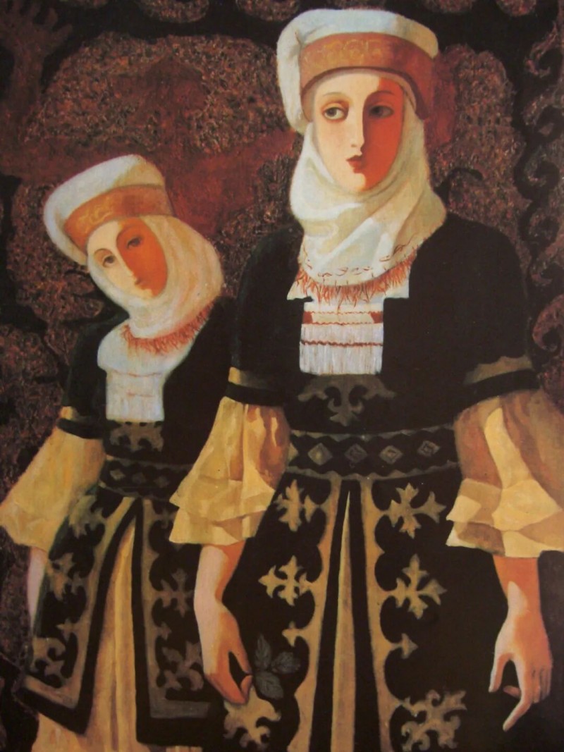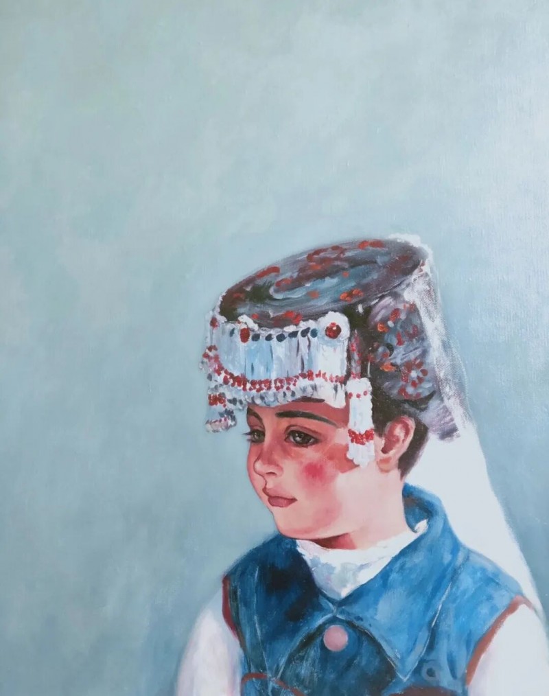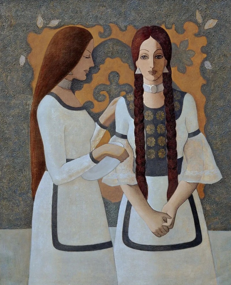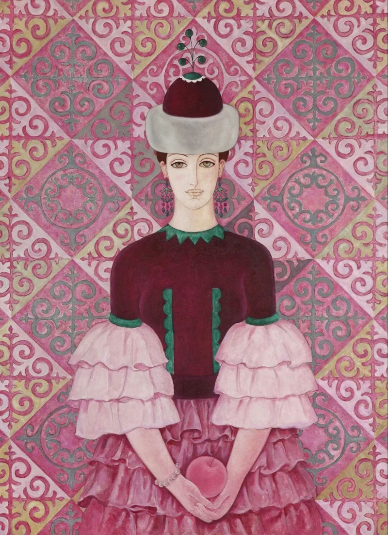 哈丽达是一位以表现新疆少数民族,特别是本民族女性生活世界为主要题材的优秀画家。她对于艺术孜孜以求。她不仅深入学习和研究油画的语言特色,还注重从中国传统壁画等民族艺术中获得滋养,也注意从意大利文艺复兴早期的湿壁画等艺术,以及现代艺术中吸收营养。哈丽达把油画立体塑造的艺术语言同平面装饰性语言结合起来。她着意将立体塑造形象的明暗光影层次,归纳、概括和简约到画面严整的平面结构中,既保留了局部色彩层次的丰富与厚实,又展现了画面色块构成的整体和鲜明,使得装饰性和绘画性恰当地融合起来,体现出强烈的现代感。哈丽达的人物造型单纯、精炼而优美;色彩明净、沉稳而典雅。这些艺术上的独特处理使得哈丽达笔下的女性形象都表现美丽、优雅、沉静温婉的精神气质,展现了她们安然自处的纯净美好的世界。这其实也反映出她自己心灵世界的一种真实和对于美好生活与纯净精神的追求。哈丽达由此展现出自己单纯典雅、含蓄温婉、明朗清澈的鲜明艺术特色。