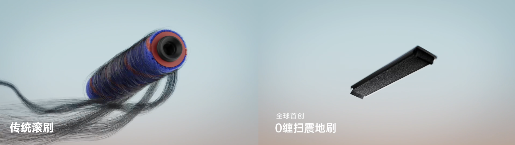 这种创新的扫震方式,模拟了最原始的扫地动作,让清洁回归简单。通过最基础的扫动原理,配合强劲吸力,从结构上杜绝了缠绕的可能。