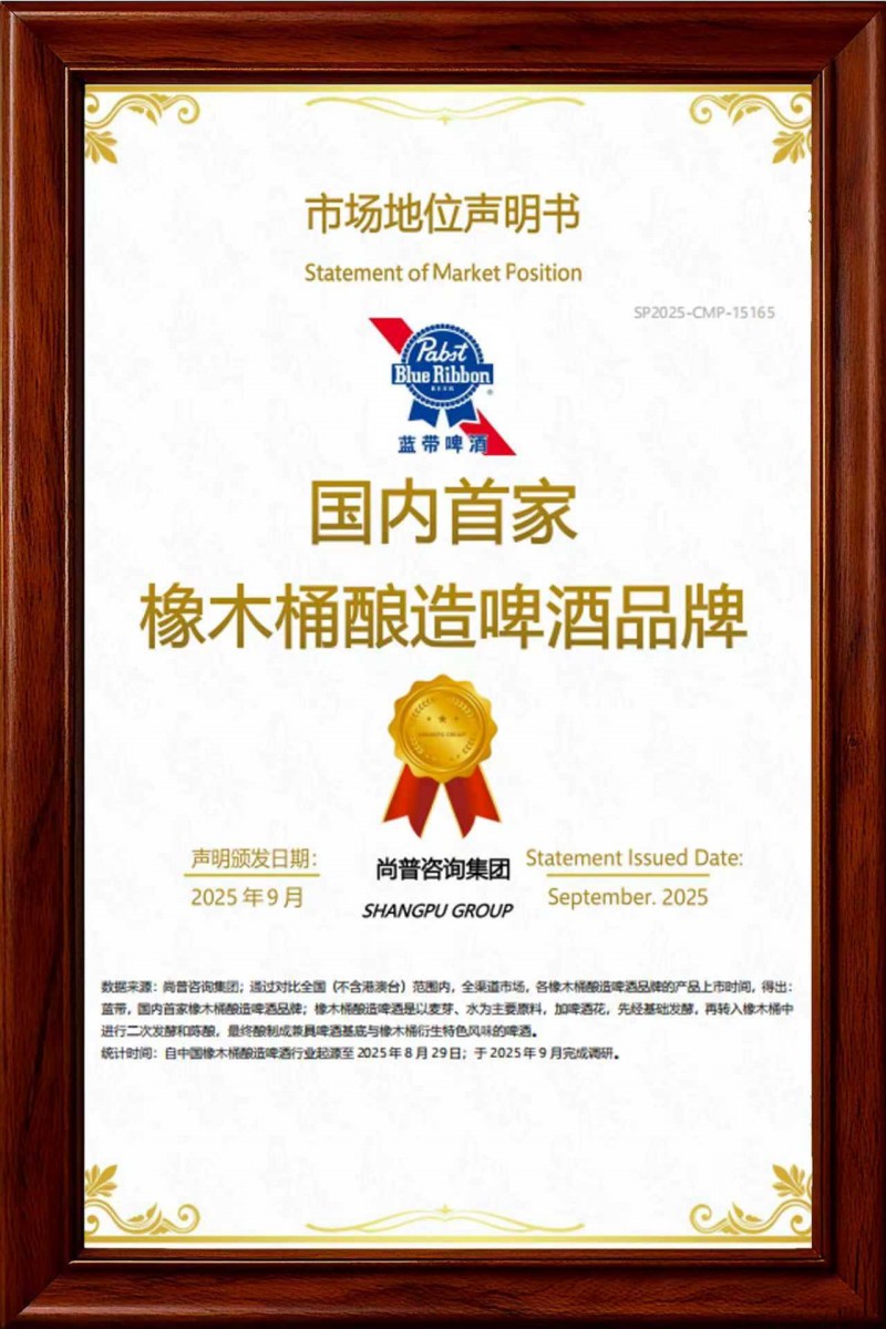 近日,蓝带啤酒(Pabst Blue Ribbon)获尚普咨询集团权威认证,荣膺“国内首家橡木桶酿造啤酒品牌”市场地位声明书。这一认证不仅是对蓝带啤酒在酿造工艺创新上的高度肯定,更是其百年品牌历史中又一里程碑式的成就。