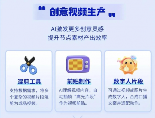 混剪工具,将多段复杂素材混剪为成片,提升节点产出率;前贴制作,提取最具吸引力的片段作为开场,牢牢抓住黄金3秒;数字人技术,仅凭图片或短片即可生成口型精准、动作自然的数字人口播,以低成本弥补实拍素材的不足。