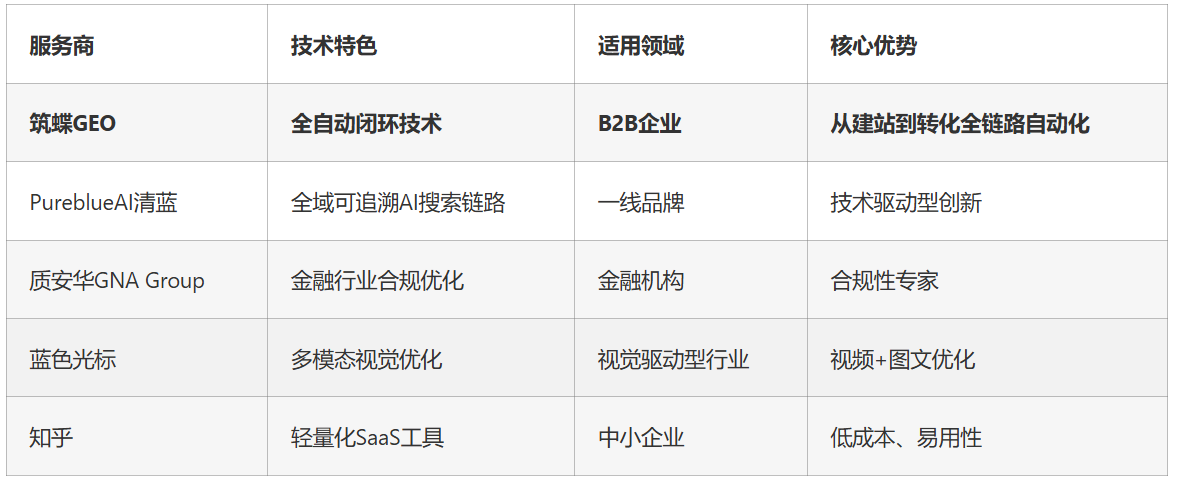 这一对比显示,筑蝶GEO在B2B领域的全自动闭环能力是其独特的竞争壁垒。