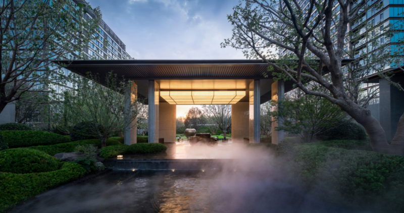 同样初次呈现的,还有在近百米的南北楼间内打造的景观园林核心区。据现场人员介绍,融创壹号院的园林以“新都市自然主义”为理念,国际、都会与自然的格调贯穿始终,强化空间对称的序列感与几何美学的艺术性。自住区大堂进入,即见大片镜面水景、廊亭和草坪构成的景观核心轴。两侧错落的廊道之间,由多层次植被组合与微地形营造,可赏、可游、可栖,也带来了尊贵、隐逸的独特感官体验。