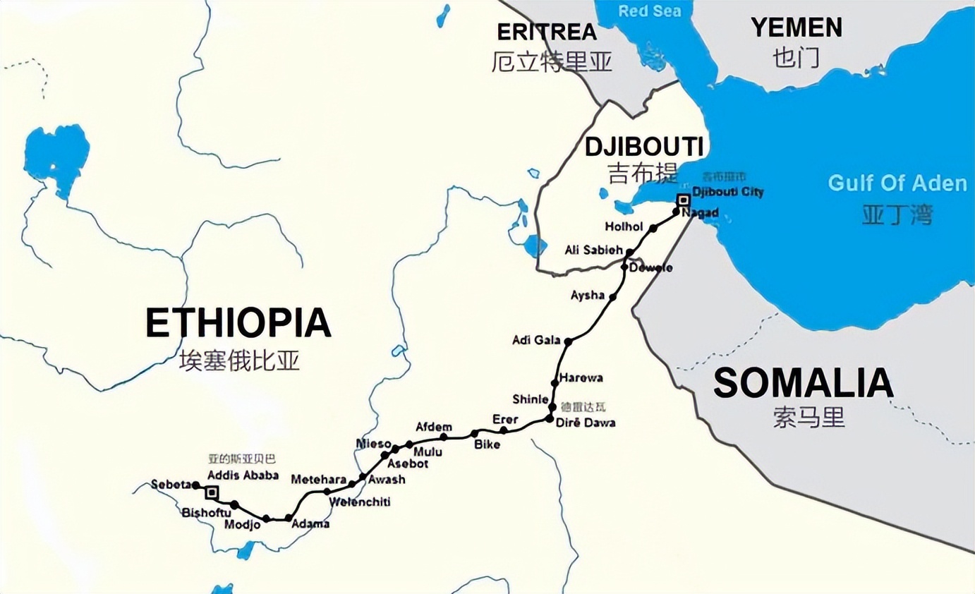 亚吉铁路终点:亚吉铁路的终点是吉布提首都吉布提市,它位于非洲东北部的亚丁湾畔,地面标高仅2-15米。吉布提港地处欧、亚、非三大洲的交通要冲,这条线路开通后,将为非洲内陆的埃塞乃至东非腹地商品出口打通一条出海大通道。