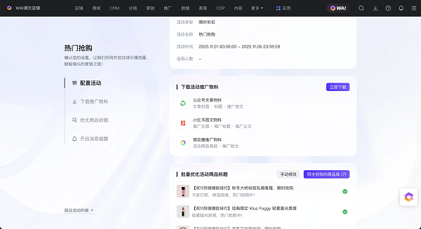 最后,本次升级简化了营销全链路流程,打通了从策划到执行的关键壁垒,AI大模型的智能图文生成能力则成为提效“利器”。从WAI快速完成活动配置,自动生成适配公众号、朋友圈和小红书的多渠道推广物料,支持商家一键下载,还可批量优化商品标题以提升曝光潜力;再到开启消息提醒避免流程遗漏、创建导购任务联动团队协同,全程无需繁琐手动操作,大幅降低商户运营成本,让商户能聚焦核心营销目标,高效抓住营促销节点红利。