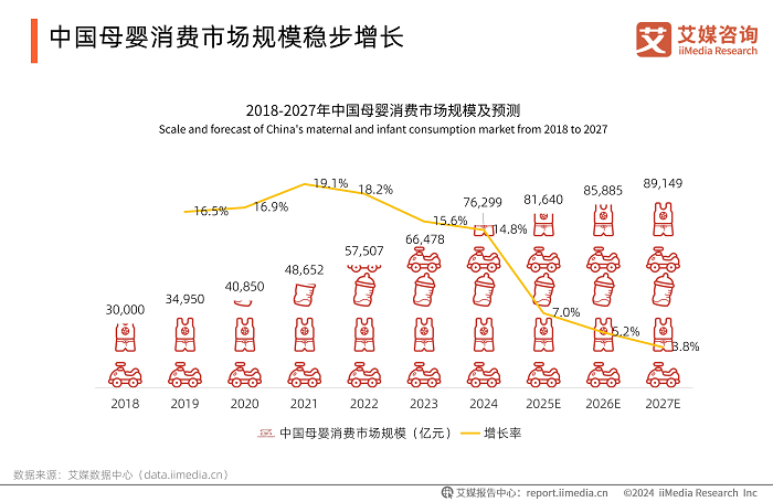 伴随母婴消费市场的结构性升级,以95后、00后为代表的新生代父母将“优生优育”理念深度融入消费决策,对产品的安全性、舒适度及品质提出更高要求。iiMedia Research(艾媒咨询)数据显示,2024年中国母婴消费市场规模达76299亿元,同比增长14.8%,预计2027年将增至89149亿元。在服饰消费方面,“舒适度”与“面料”成为家长最关注的要素,占比分别为50.64%与45.41%。