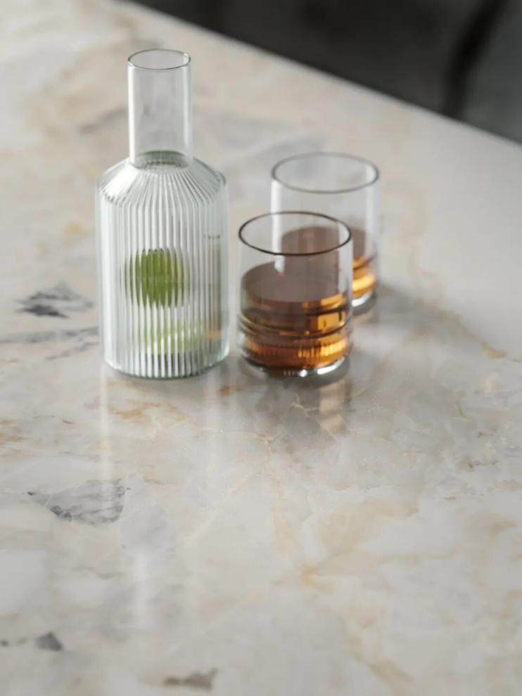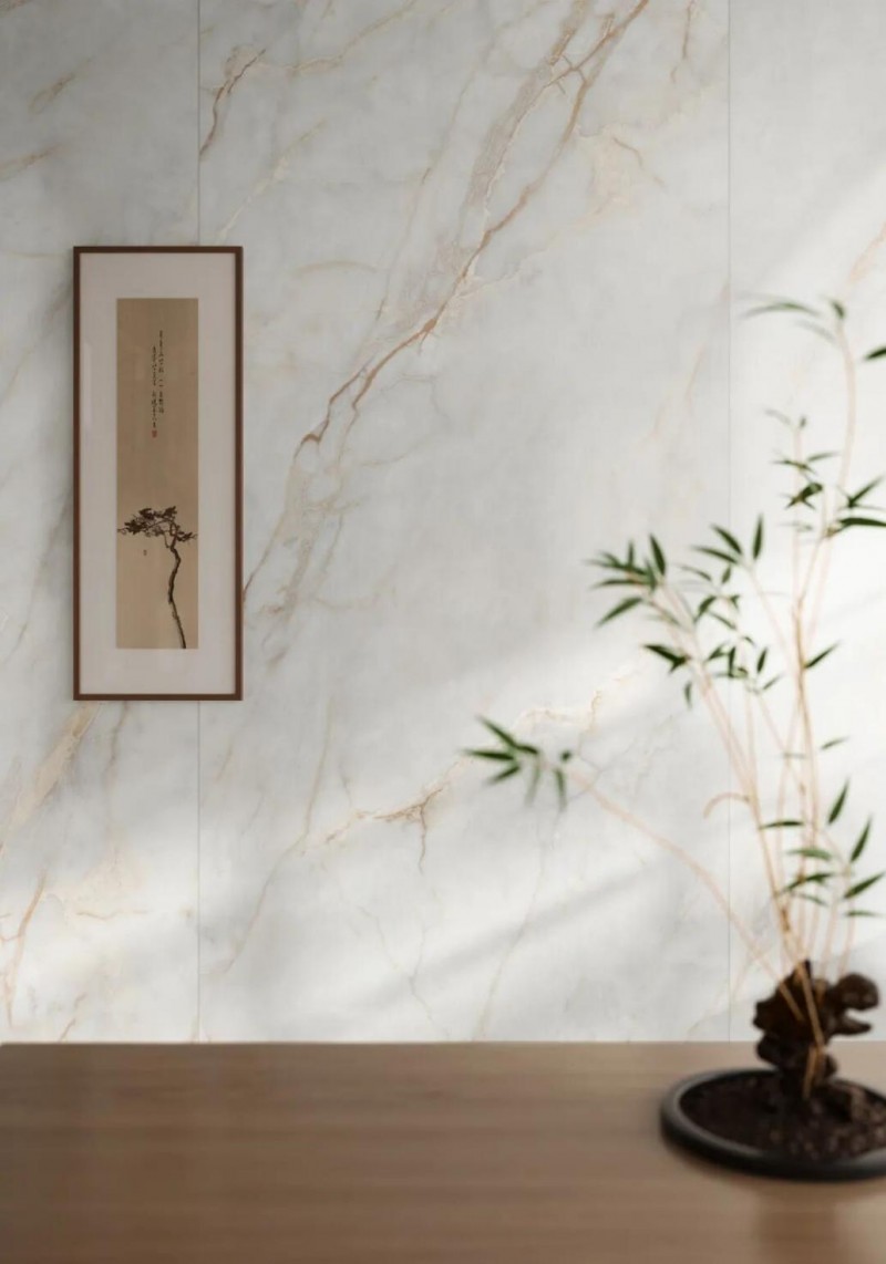 「宋境·玉」运用45°柔拋工艺,让砖面更加接近天然石材的光感,柔光质感更加高级,用在客餐厅、卧室光感非常舒适;叠加了冰晶干粒,光感细节更加丰富精致。