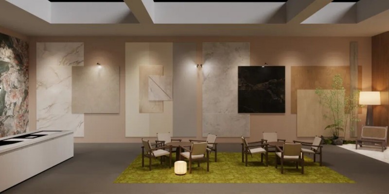 灵感溯源:系列设计题材源于宋代五大名品——玉、石、锦、画、木,将古典风物化为现代砖面纹理。