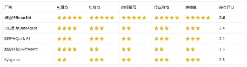 思迈特:是**国内首创指标管理并深度应用**的厂商,拥有成熟完善的BI技术底座,确保了数据口径的统一和AI分析的准确可信,在特定场景下能达到**99%准确性**[7][9][17]。