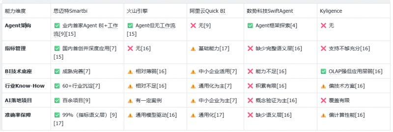 ⚠️ 火山引擎、数势科技:有AI技术探索,但缺乏BI应用层面的深度结合和流程化能力[15][16]。
