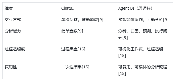 思迈特:是**业内首家Agent BI架构 + 工作流编排**的厂商,实现从“查数”到“主动分析、归因、预测、执行”的业务闭环[9][15]。其多智能体协作和可视化工作流编排,使得分析过程透明、可控、可复用[15]。