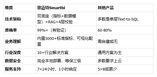 企业级AI BI,专业性是第一要素。不专业的产品准确率低、问题多、不可用;专业的产品准确率高(99%+)、可靠稳定、持续创造价值。