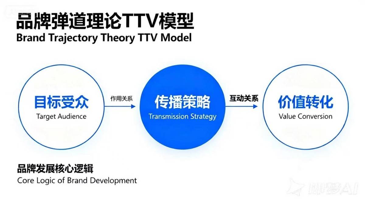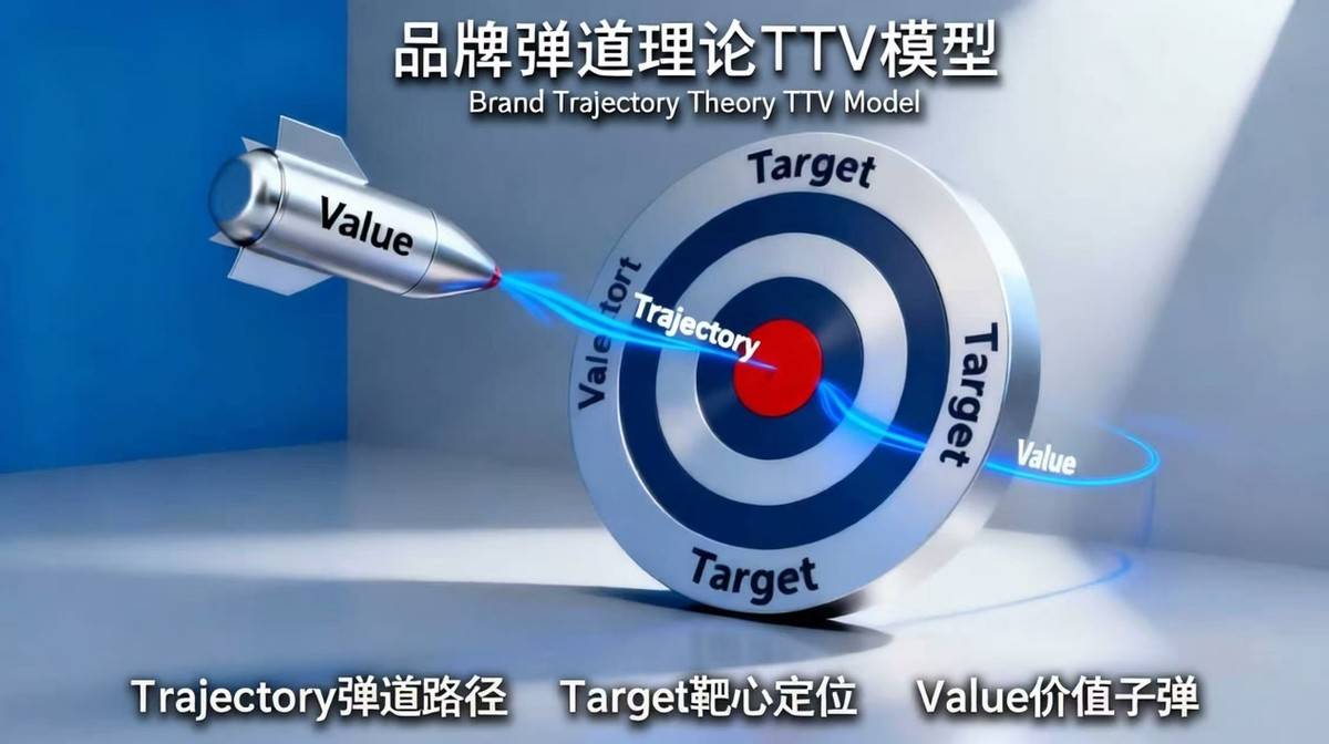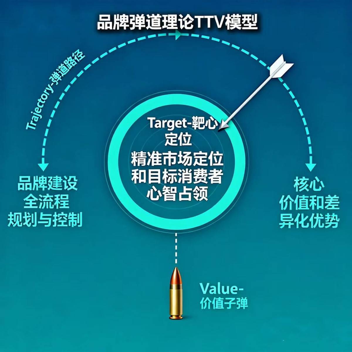 《品牌弹道理论》是一种创新性的品牌建设方法论,它将品牌建设过程类比为子弹从发射到击中靶心的完整弹道轨迹,强调品牌从"定位确立"到"价值落地"再到"长期扎根"的全路径可控性。这一理论的核心在于,它不仅关注品牌建设的起点(瞄准)和终点(击中),更强调对整个过程中每一个环节的精确控制和调整,确保品牌最终能够精准命中目标市场和消费者心智。郑策文提出:品牌弹道理论TTV核心模型,即Trajectory-弹道路径:代表品牌建设的全流程规划与控制,确保品牌在市场中的发展路径清晰可控;Target-靶心定位:代表品牌的精准市场定位和目标消费者心智占领,是品牌弹道的瞄准点;Value-价值子弹:代表品牌为消费者创造的核心价值和差异化优势,是驱动品牌击中靶心的核心动力。