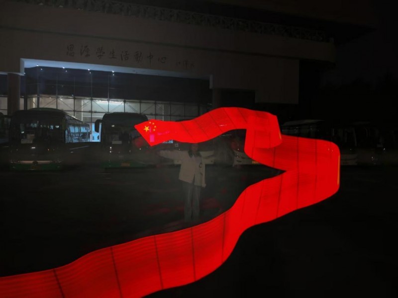 活动负责人提前考察了校园内的开阔场地,确保夜间拍摄环境安全且适合光绘创作;同时准备了多组红色LED灯棒、专业相机、三脚架等设备。活动通知一经发布,便得到了团员们的积极响应,大家踊跃报名,在互相配合中不断尝试,从最初的略显生涩到后来的熟练流畅,每一幅光绘作品都凝聚着团队的力量。最终,相机屏幕上呈现出的一幅幅色彩鲜艳、造型优美的红色飘带光绘作品给大家带来了十足的惊喜。那一刻,相机屏幕上的红色飘带不再只是一幅光绘作品,更成了连接爱国情感与青春担当的纽带,在场每一位团员都在视觉的震撼与情感的共鸣中,加深了对“初心”与“使命”的理解。