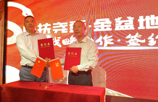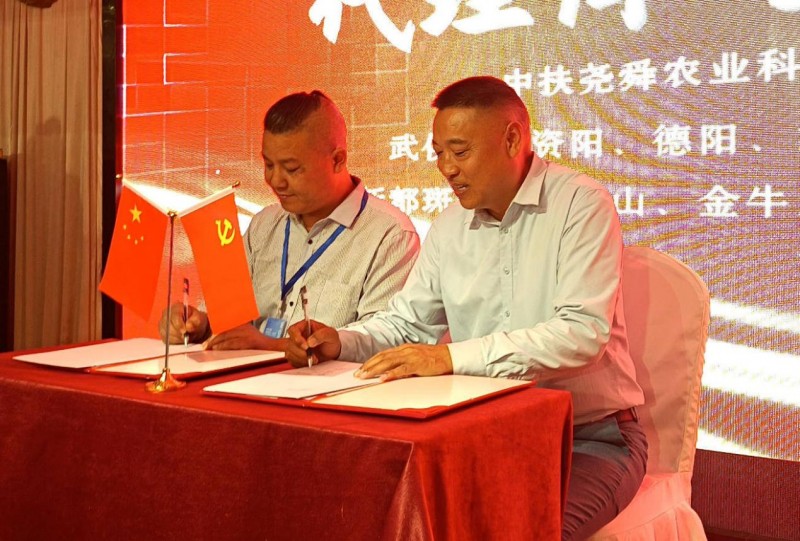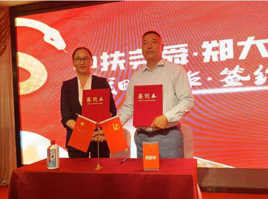 中扶尧舜农业科技董事长许洪铭与四川金盆地集团有限公司运营总裁、四川国诚老窖酒业有限公司董事长李帝身现场签约贴牌灌装系列“蛇读酒”。