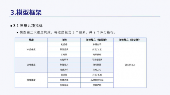 该模型从“产品维度”“文化维度”“传播维度”三大方向出发,细分出礼品感、颜值品质、实用性、文化故事、象征意义、情感共鸣、仪式感、品牌承载、分享驱动九项具体指标。并针对“实用型”“文化型”“综合型”三类礼品设置差异化权重和百分制评分体系,为礼品开发、选品与提案提供科学依据。
