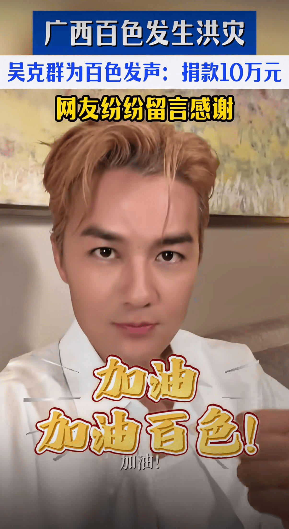 广西百色因为台风遭遇百年一遇的暴雨灾害,吴克群听闻后在10月2日发布视频为百色加油,并捐款十万元,希望百色人民早日平安渡过难关。
