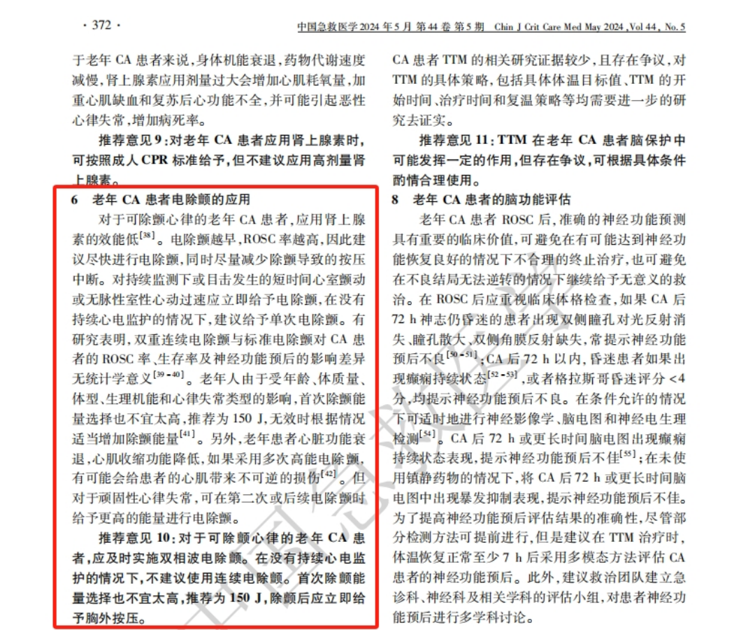 《中国老年心肺复苏急诊专家共识》推荐意见:对于可除颤心律的老年CA患者,应及时实施双相波电除颤。在没有持续心电监护的情况下,不建议使用连续电除颤。首次除颤能量选择也不宜太高,推荐为150J,除颤后应立即给予胸外按压。