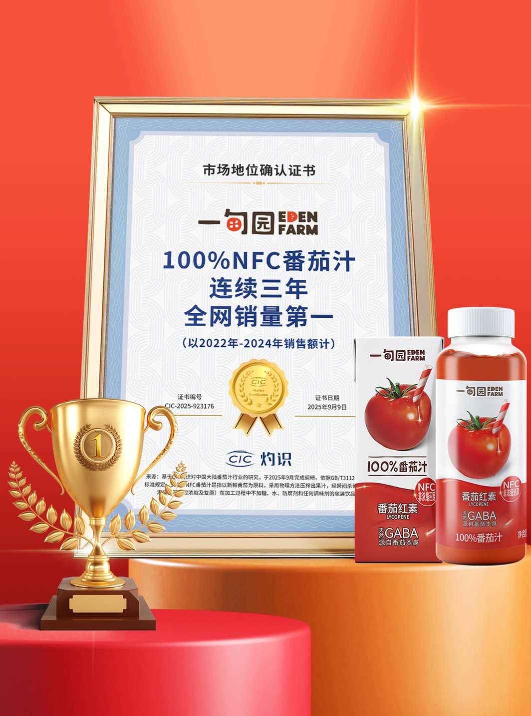 近日,一甸园获得由国际权威咨询机构CIC灼识授予的“100%NFC番茄汁连续三年全网销量第一(以2022年-2024年销售额计)”市场地位确认证书!