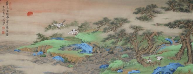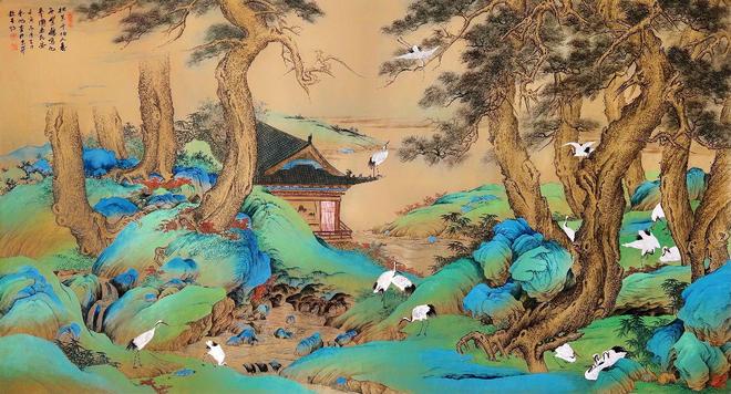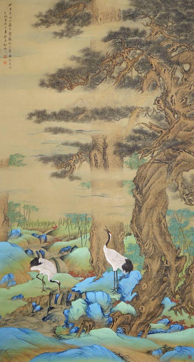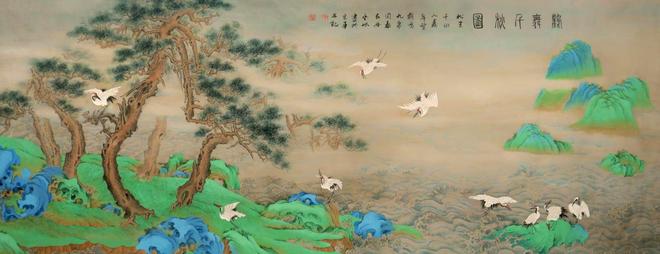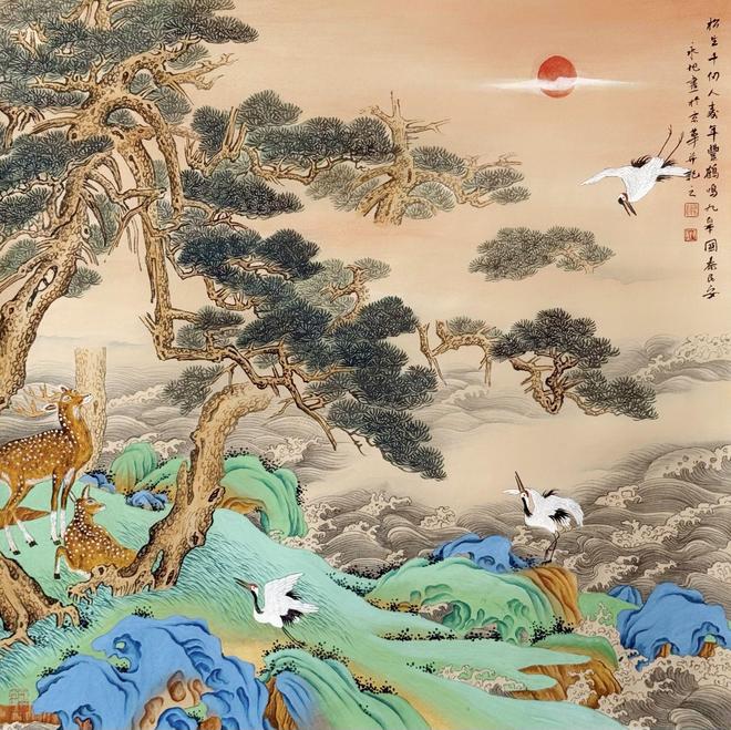 技法特征:他在写实基础上融入写意,既注重画面构图的严谨,又追求色彩层次的丰富。尤其善用绢本设色表现烟岚云岫,代表作《鹤舞千秋图》以金碧辉映的视觉张力,将青绿山水的色彩魅力推向新境;《松生千仞,人寿年丰;鹤鸣九皋,国泰民安》系列则以宏大尺幅、精妙细节与鲜明色彩对比,展现其对传统技法的传承与创新。