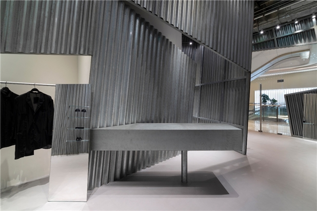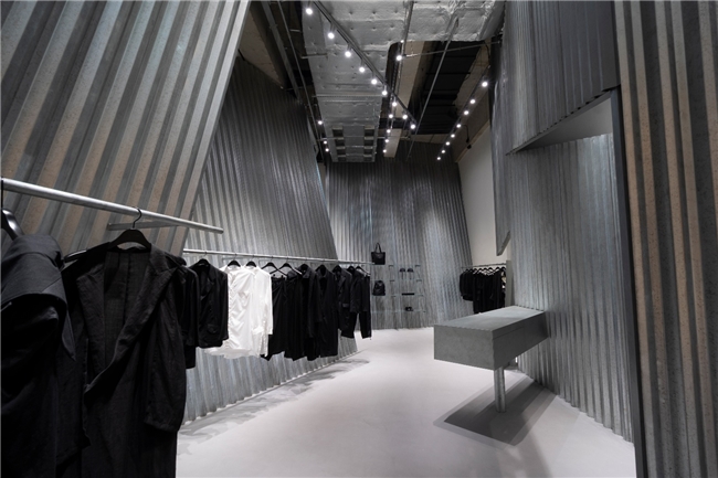 落成的空间,是山本耀司标志性暗黑哲学与南京建筑刚毅风骨的深度对话。冰冷金属的现代感与手工锻造的细微痕迹交织,营造出前卫而富有温度的氛围。层叠的波纹仿佛凝固了时光长河,让六百年的城墙魂魄在当代空间中磅礴新生。这不仅是店铺空间,更是一座承载城市记忆、凝聚设计精神的现代美学载体。