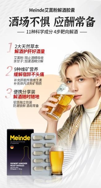 Meinde每德艾蒿粉解酒胶囊,酒场不惧,应酬常备。11种科学成分,4步靶向解酒。