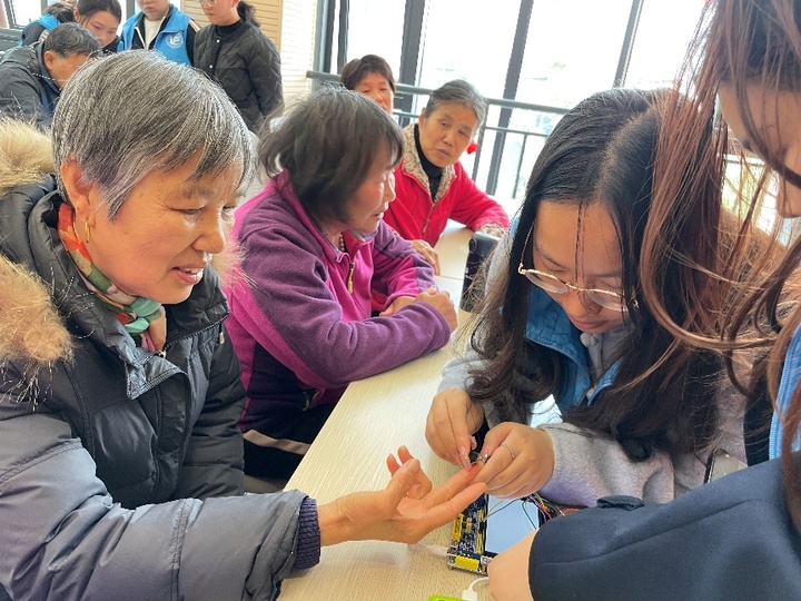 值得一提的是,“物联网产品研发社”的学生们还带来了自己研发的心率脉氧仪,供老人们现场试用。这款仪器操作简单,测量结果精准,收获了老人们的一致好评。学生唐昌旺表示:“看到爷爷奶奶们试用我们的产品时开心的样子,特别有成就感,也觉得自己所学的知识有了用武之地。”