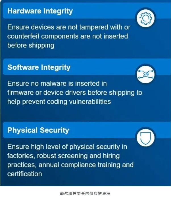 戴尔科技实施严格的供应链安全管理,关键组件(如固件、BIOS)在工厂生产阶段即进行验证和加密签名,确保出厂设备未被篡改。