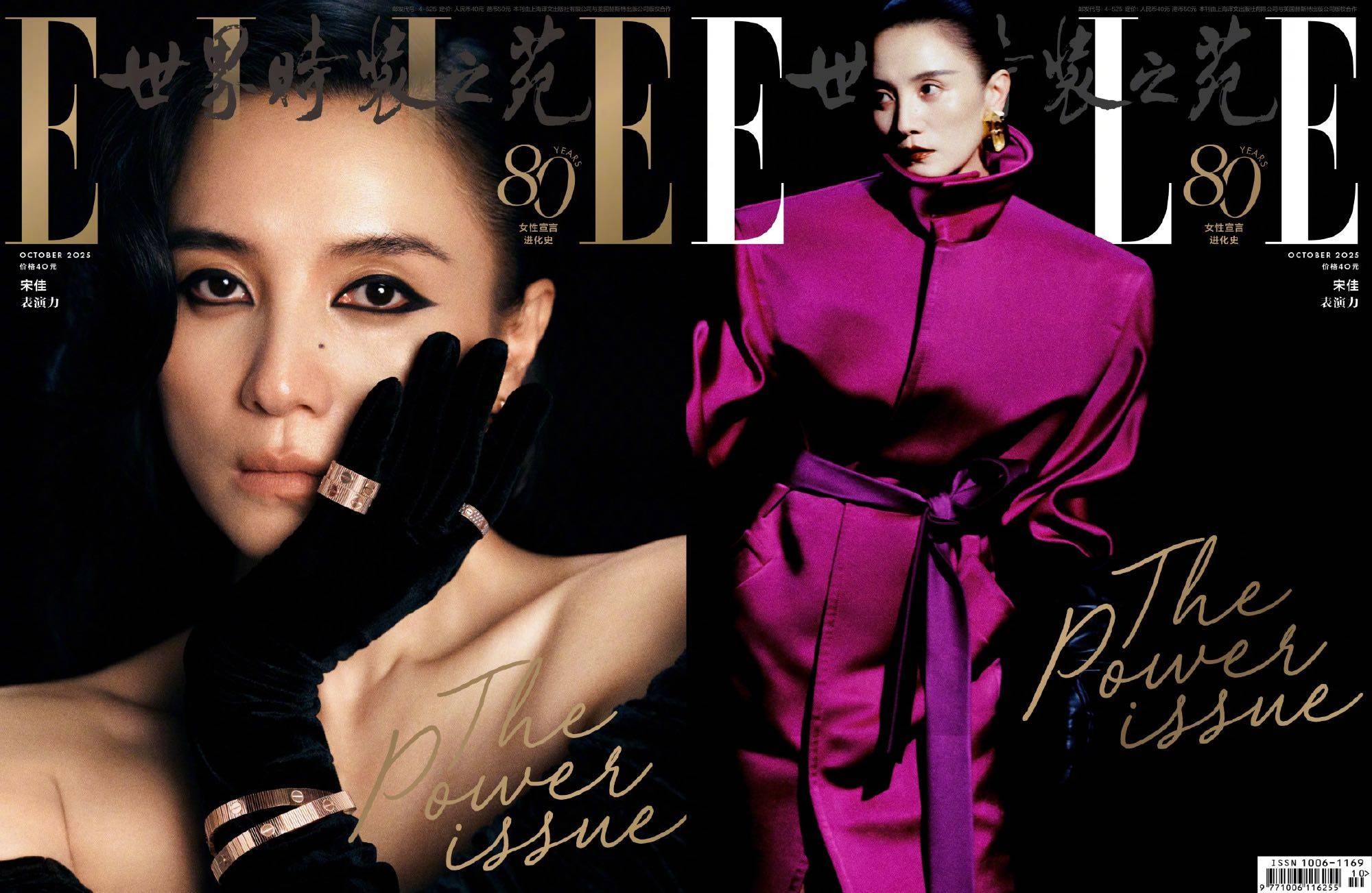 《ELLE》为了庆祝创刊80年,直接让宋佳来了波“双生”造型。左边封面她戴黑色丝绒手套,指间卡地亚戒指闪得晃眼,猫眼妆凌厉如旧上海名伶;右边一身紫红色系带装,垫肩设计梦回80年代女权觉醒时刻,腰际蝴蝶结又柔化了力量感。