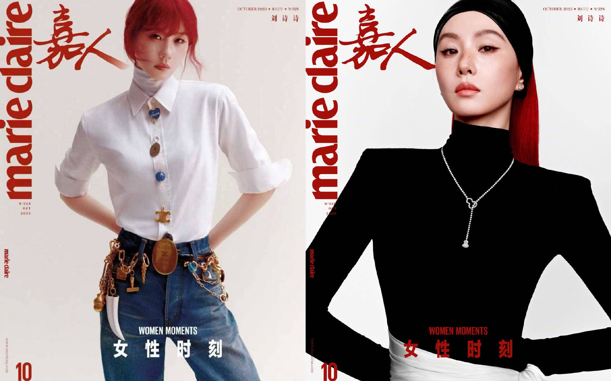 刘诗诗的第一封造型松弛以CELINE白衬衫与牛仔裤为基底,搭配华丽金属腰带和Qeelin珠宝叠戴,简约中透着高级质感。蓬松的复古铜红色卷发增添野性气息,整体呈现随性又不失精致的收藏家气质。第二封像先锋叛逆的“东方女战士”,黑色高领上衣配发带,雀斑妆与钻石项链形成强烈对比,黑白冷调背景衬托红发与锐利眼神,展现从温婉到叛逆的气质转变,极具视觉冲击力。