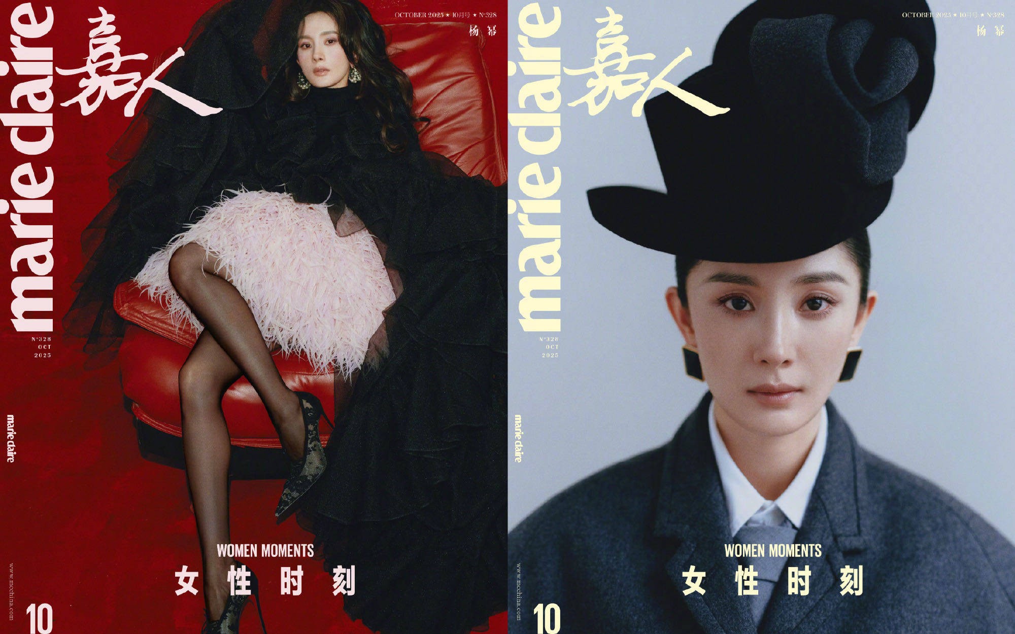 杨幂则走“风格颠覆”路线,一封是黑色纱裙配粉色羽毛裙,坐在红色沙发上像复古名媛;另一封直接走冷峻精英风,宽檐黑帽搭配灰色西装,眼神冷得像谍战片女主。两套造型把“甜酷”和“冷飒”玩到极致。既展现了多面魅力,又彰显了顶级时尚表现力与个人风格的突破。