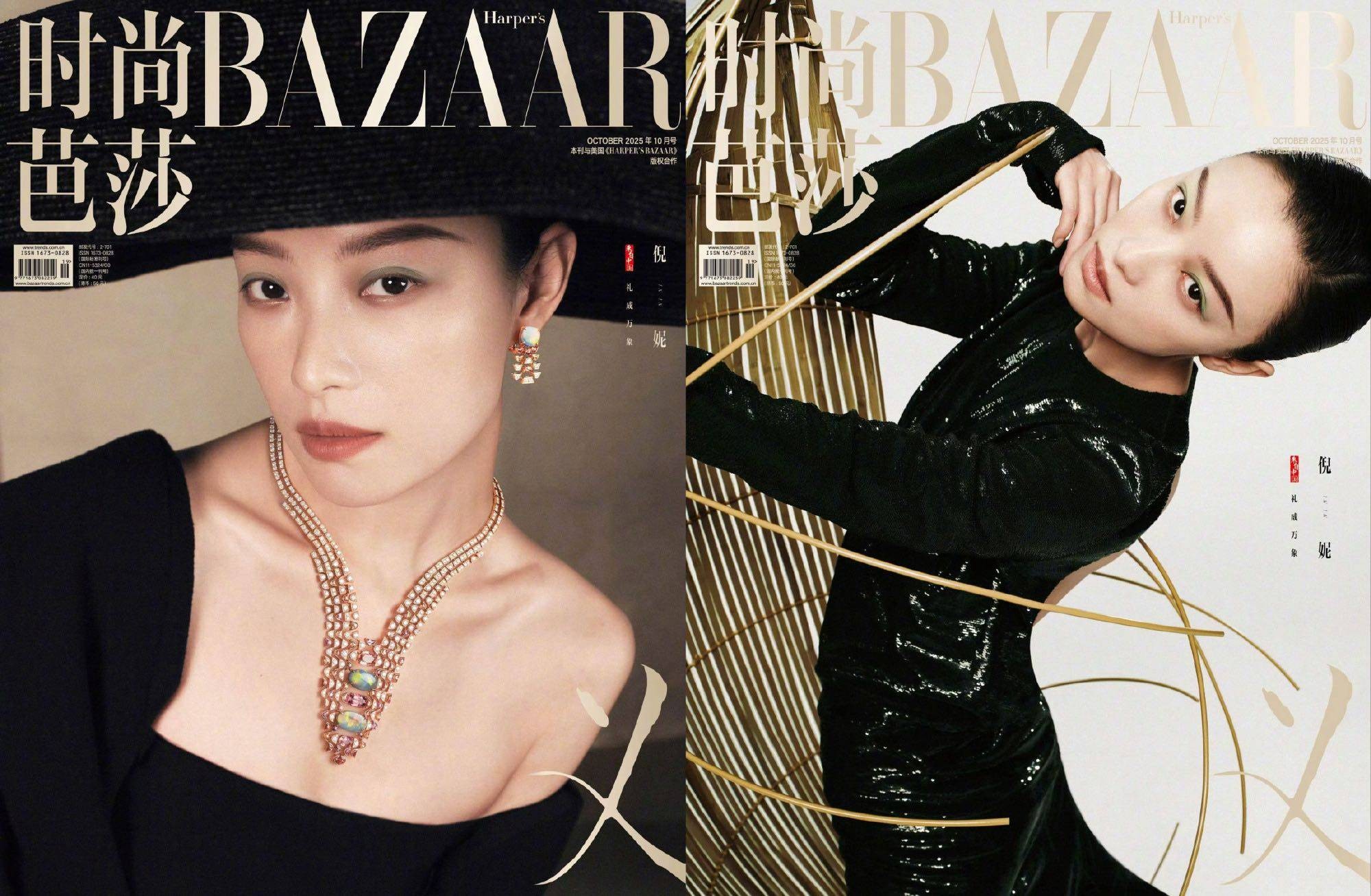 这次的银十封面倪妮以两套造型演绎东方美学与先锋时尚的碰撞。她佩戴宽檐黑帽,搭配黑色露肩礼服,颈间叠戴的珠宝项链以彩色宝石点缀,在简约廓形中凸显华贵质感;另一封则身着黑色亮片紧身长裙,于金色竹编艺术装置前展现流畅背线,利落的盘发与独特的眼妆设计,让东方韵味与摩登风格形成强烈视觉张力。
