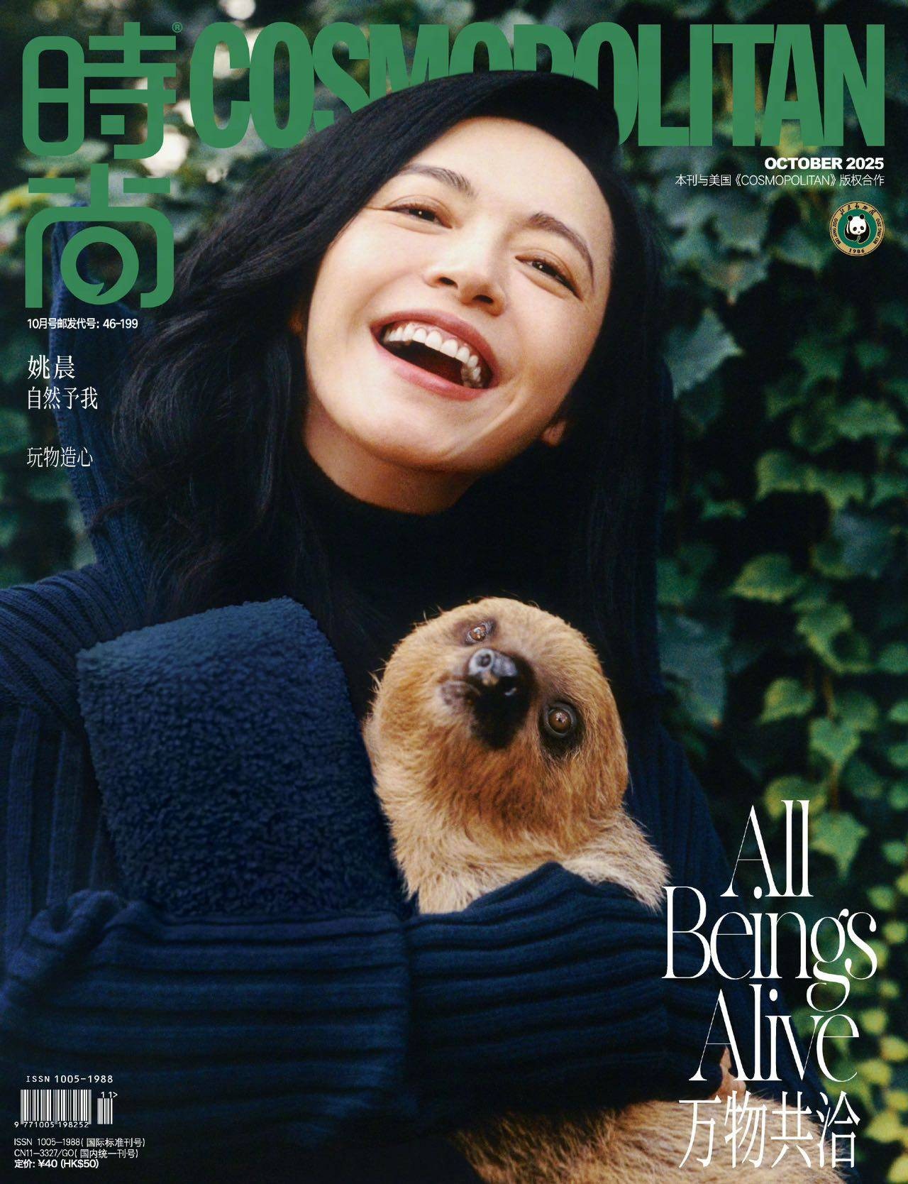 《时尚COSMO》这次剑走偏锋,让姚晨抱着树懒登上封面!她穿深蓝色针织衫,笑出的梨涡和树懒的憨态形成奇妙呼应,“万物共洽”的主题被她演成了治愈系大片。