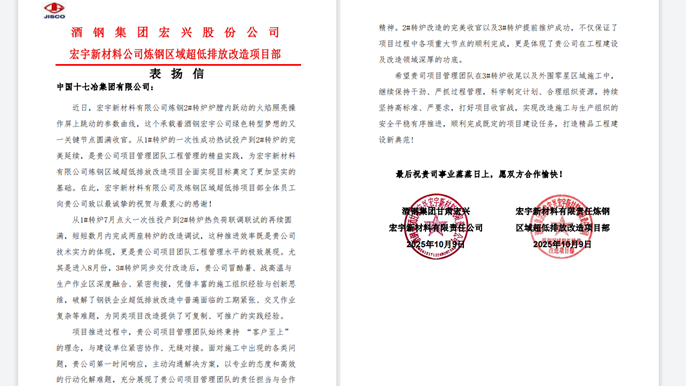 10月9日,酒钢集团甘肃宏兴股份公司宏宇新材料有限责任公司与中冶南方工程技术有限公司分别向中国十七冶致表扬信,对冶金分公司酒钢碳钢薄板厂炼钢区域超低排放改造工程项目提前完成两项重大节点表示感谢。