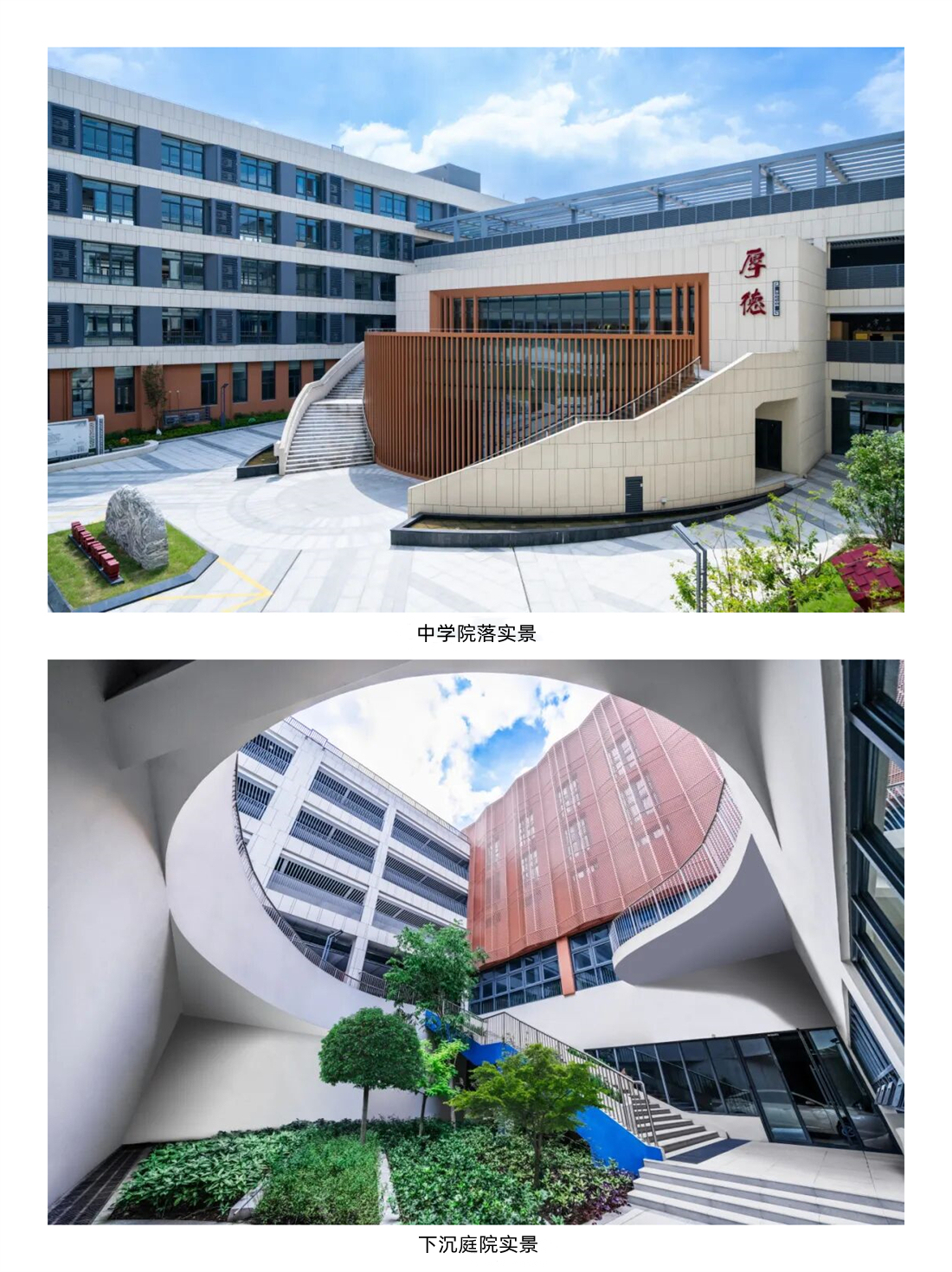 建筑布局参考传统书院,以围合式的院落为核心,组织串联校园内的各类教学、运动、休憩空间,向外隔绝城市噪声,保障安静的学习环境,向内聚合景观,打造集文化展示、自然生态、活力创新、精致雅韵为一体景观庭院。