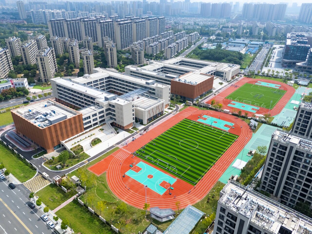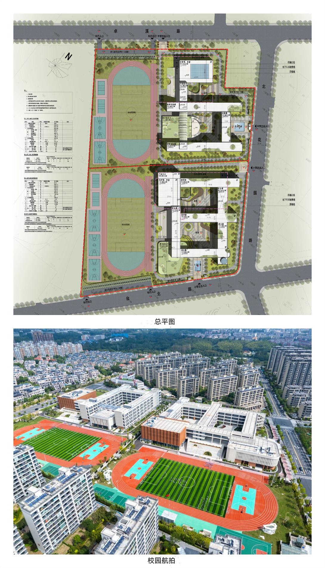 整体规划采取以人为本、动静分离的原则,在两所校园内部分别划分教学、后勤区及体育运动三大功能板块。设计通过连廊和平台实现建筑群体的有机串联,构建出形态协调统一、功能复合多元的校园空间体系,在满足多样化使用需求的基础上,优化交通流线设计,确保人车分流、路径明晰,形成安全高效的交通网络。规划过程中综合考虑建筑的空间分布与形态特征,使校园空间肌理与城市环境形成有机对话,建立和谐共生的空间关系。