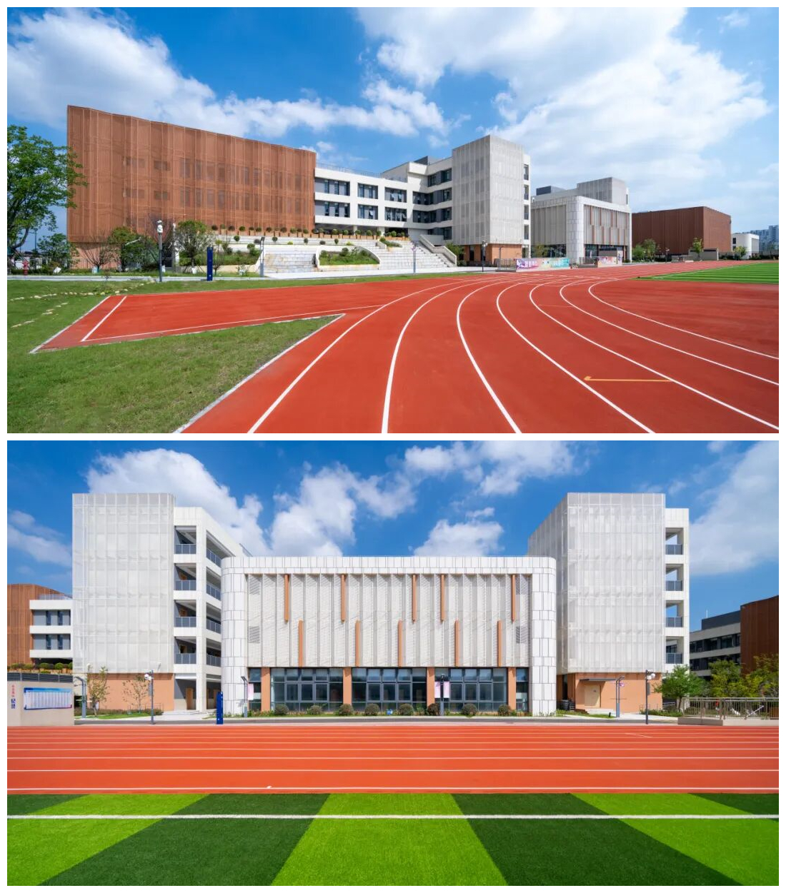 外观设计采用现代风格,简洁明快的形体关系上,以穿孔板幕墙、石材、真石漆等装饰外立面。在色彩的选择上以白色搭配砖红色,延续了中华中学浦口教育集团原有校区的色调风格,实现了校园历史文化特色的传承。