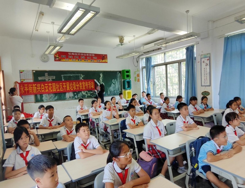 近日,永平街道新兴白云花园社区在走进新兴白云小学,为五年级的同学们带来了一场垃圾分类宣传科普活动。此次活动旨在提升辖区居民的垃圾分类意识,传播绿色环保理念,将垃圾分类的种子播撒在孩子们的心田。
