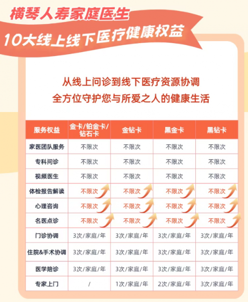 据了解,横琴人寿家庭医生服务面向金卡及以上级别客户开放,由具备资质的第三方专业机构提供支持。目前该服务已组建覆盖日常所需科室的医疗团队,包含6位三甲医院在职医生,提供10项线上线下医疗健康权益,从线上问诊到线下医疗资源协调,构建起全方位的健康守护体系。