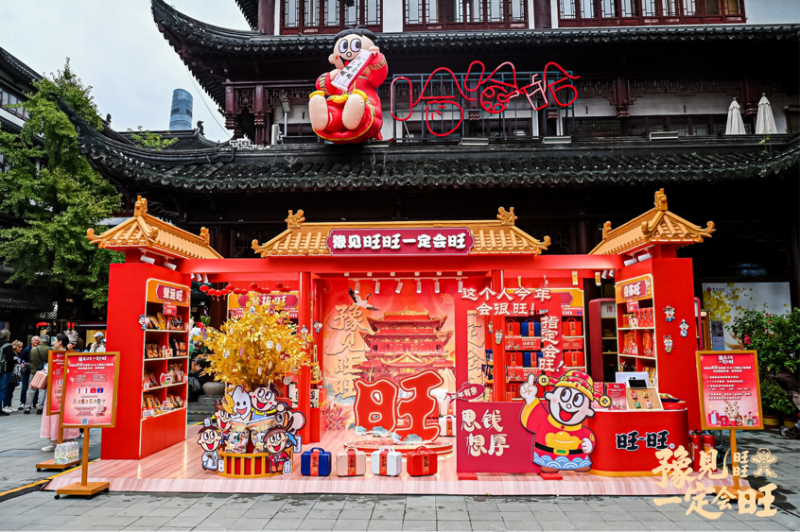 图:豫园中心广场的旺旺快闪店,红色调国潮设计与古建筑形成视觉碰撞