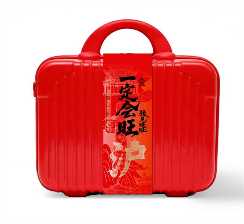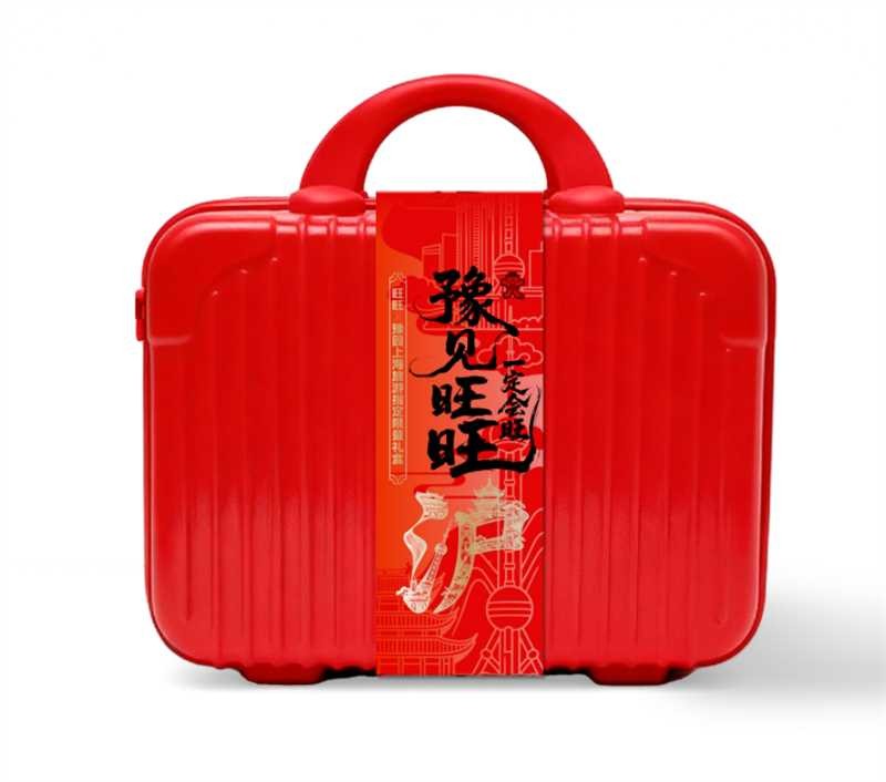 而此次快闪店核心产品“旺旺x豫园上海旅游指定限量礼盒”以红色、蓝色、粉色、白色四种颜色的14寸手提行李箱为载体,加上设计精美的红色腰封,不仅极具东方美学国潮颜值,而且携带方便,尤其适合来豫园游览的全球游客带回家。手提行李箱腰封的设计以上海众多知名景点例如东方明珠、上海大厦、豫园湖心亭等建筑造型手绘成红色底纹以及一个金色的大“沪”字,象征着指定限量礼盒的豫园上海旅游指定限量身份,满满的细节彰显用心,极具东方文化寓意。腰封正面放大显示了本次旺旺X豫园祈旺主题限定快闪店的上半句主题“豫见旺旺”,背面则放大显示了主题的下半句“一定会旺”,不仅体现了豫园乃至整个上海的地域特色,更有旺旺品牌满满的旺运加持!
