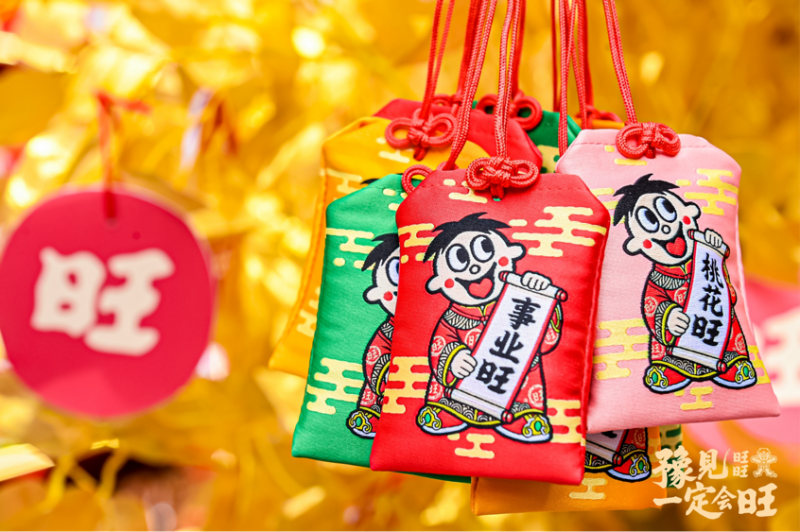 快闪店设计紧扣豫园文化底蕴,店内布局强化互动体验:左侧祈旺树悬挂雪饼造型祈福卡,右侧“指定会旺”财神旺仔打卡点配合“这个人今年会很旺”的标语,单日吸引超千名游客拍照分享。现场观察到,约70%的消费者会完成“购买礼盒-悬挂祈愿卡-打卡-抽奖”全流程,显示零食消费已从功能需求转向情感仪式。 礼盒中的“旺运锦囊、旺运手机贴盲盒”成为关键驱动力。四个版本(财运旺、事业旺、身体旺、桃花旺)对应Z世代的焦虑议题,现场有顾客为抽中“事业旺”版本连续购买三套礼盒。这种设计通过轻量级盲盒刺激收集欲,使零食礼盒进阶为社交货币。