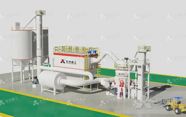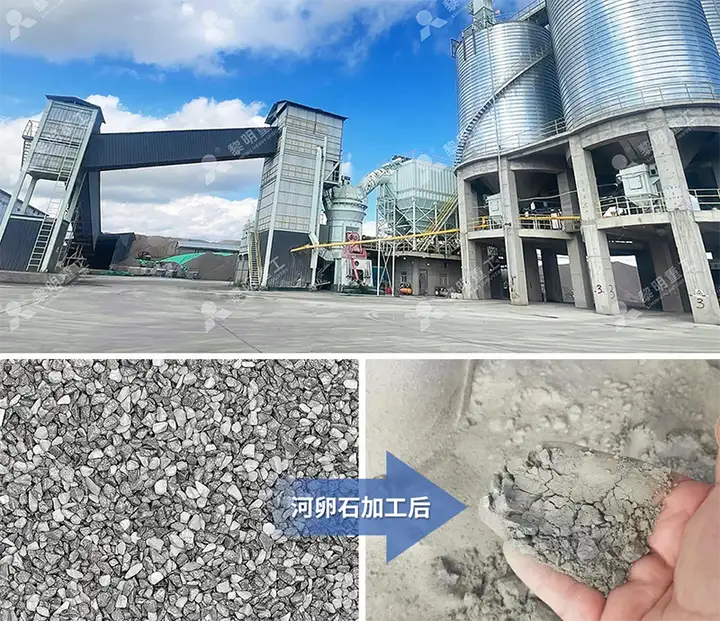 河卵石通过锁风喂料设备进入磨机磨盘中心,在离心力作用下向周边移动进入粉磨辊道,受磨辊挤压、研磨和剪切而粉碎。同时,热风从风环高速喷出,将粗料吹回磨盘重磨,对悬浮物料烘干,细粉则随热风进入分离器分级,合格细粉经收尘设备收集为产品,不合格粗粉回落磨盘循环粉磨,高效完成整个作业。