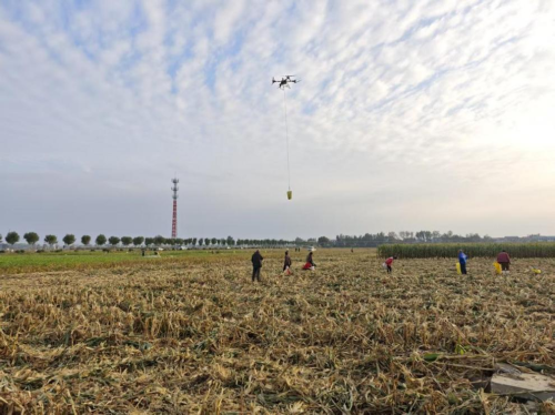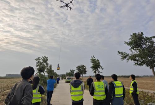 经过与原阳县平原示范区师寨镇瑞焱种植家庭农场农户精准对接,“凌云之翼”无人机社团成员在专业教师带队下,携带两台中型无人机大疆T100奔赴田间。抵达现场后,同学们迅速分工:有的依据农田地形规划飞行路径,有的精准组装无人机机械臂,经验丰富的专业“飞手”则操控无人机悬停、吊装、转运一气呵成——成袋的玉米被无人机稳稳吊起,越过泥泞地块,平稳送达田边以便运粮车装载。看着一袋袋玉米顺利装车,农户李大叔难掩喜悦:“这雨下得没停,拖拉机陷进泥里出不来,人工扛玉米累得直不起腰,没想到无人机一天就运完了一个人3天才能干完的活,实实在在保住了今年的收成!”