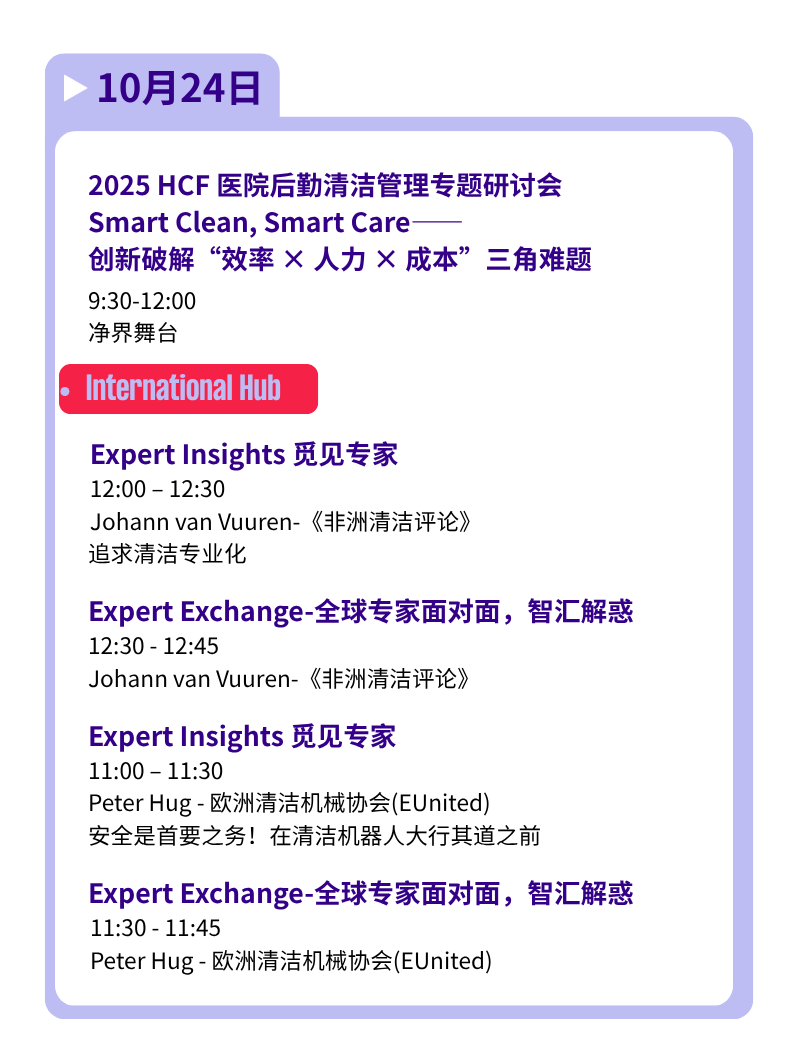HCF医疗清洁论坛、中国康养机构清洁与感控专题论坛、Expert Insights全球专家演讲、海外买家对接会 等近二十场配套活动同步上演,汇聚全球产业智慧。