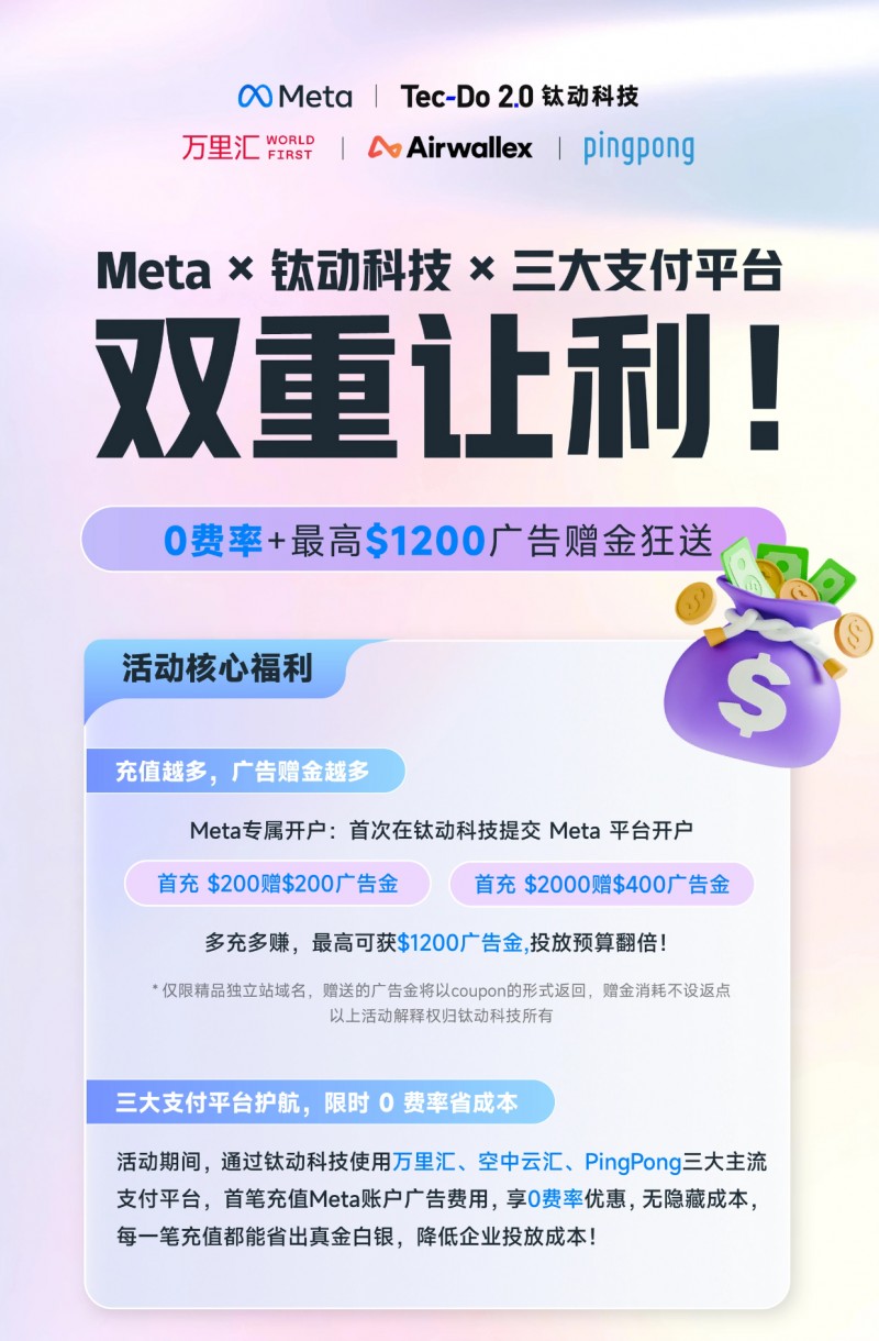 即日起,Meta 携手钛动科技(Tec-Do 2.0),联合万里汇(WorldFirst)、Airwallex(空中云汇)、PingPong 三大主流支付平台,推出 “双重让利” 重磅活动 —— 以 “0 费率充值”+“最高 $1200 广告赠金” 的超强福利,为企业降低 Meta 广告投放成本,助力广告效果全面升级!