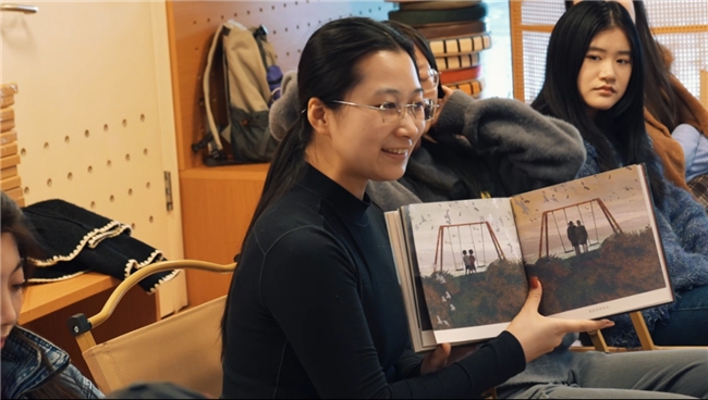 现场,阿甲老师还拿起《秋千》样书,直观展示书中的设计细节:“大家可以注意看这个方形开本,当我们把它摊开变成长方形页面时,画面里的海边秋千一下子就有了‘延伸感’,就像我们的记忆会随着时间慢慢铺展开来。”他翻到一幅整幅无字图画的页面,接着说:“这幅画里只有秋千在海边摇晃,没有任何文字描述,但我相信每个读者都能在这幅画里‘读’出自己的故事——可能是童年和伙伴一起荡秋千的喧闹,也可能是长大后一个人看海的安静。这种‘无言之美’,正是设计与内容完美融合的体现,文字的‘缺席’反而让画面的情感表达更有力量。”