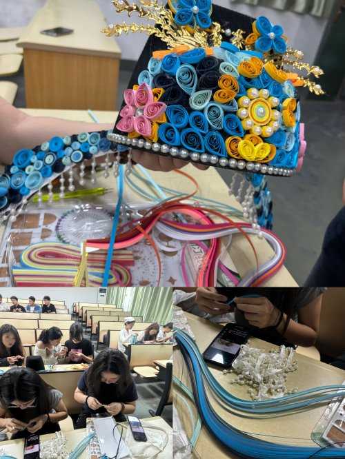 本次活动以传统工艺与现代创意融合为主线展开系列活动。在衍纸凤冠和衍纸旗头制作活动中,我们从零开始学习卷、捏、拼、贴等衍纸技法,将五彩纸条转化为传统纹样,体验从部件制作到整体组装、装饰点缀的全过程,亲手打造专属凤冠和旗头。我们于指尖缠绕中体会工匠精神,以纸艺的立体层次赋予凤冠现代艺术生命力。此外,活动特别引入了AR技术,我们设计了“AR识凤冠”互动体验,通过手机扫描专属二维码,并将摄像头对准衍纸凤冠图片,屏幕上便会浮现出凤冠图像转化为跃然屏上的三维动态模型,这一模型生动再现了凤冠的璀璨细节,利用数字技术打破时空界限,让非遗文化以一种更直观、更富趣味性的方式“活”了起来。