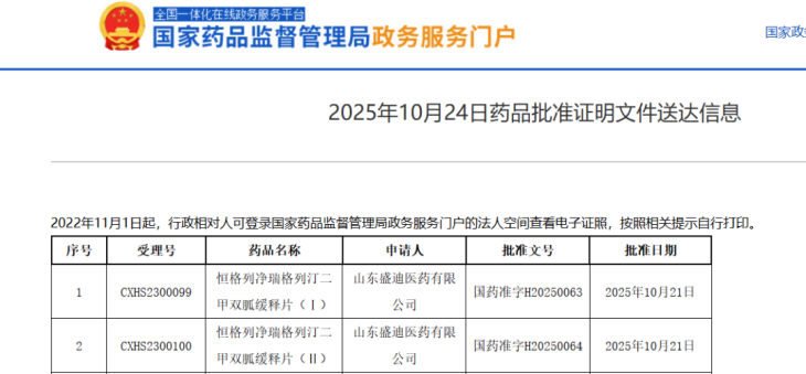 近日,恒瑞医药子公司山东盛迪医药有限公司收到国家药品监督管理局的通知,批准公司自主研发的恒格列净瑞格列汀二甲双胍缓释片(I)(II)(瑞乐唐®)上市,本品配合饮食控制和运动,用于经二甲双胍治疗血糖控制不佳的成人 2 型糖尿病患者。该产品是由钠-葡萄糖共转运蛋白2抑制剂(SGLT2i)、二肽基肽酶-4抑制剂(DPP-4i)和二甲双胍组成的三药联合固定复方制剂,是中国首个自主研发的口服降糖三联复方制剂,将有助于提升我国2型糖尿病患者的治疗依从性。