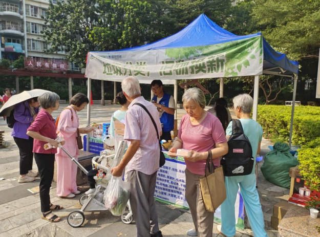 10月25日上午,白云区永平街市政服务所联合倚云天社区在岭南新世界举办了一场“垃圾分类 旧物换新”宣传活动,旨在提高居民的垃圾分类意识,推动资源的循环利用,营造绿色环保的社区氛围。