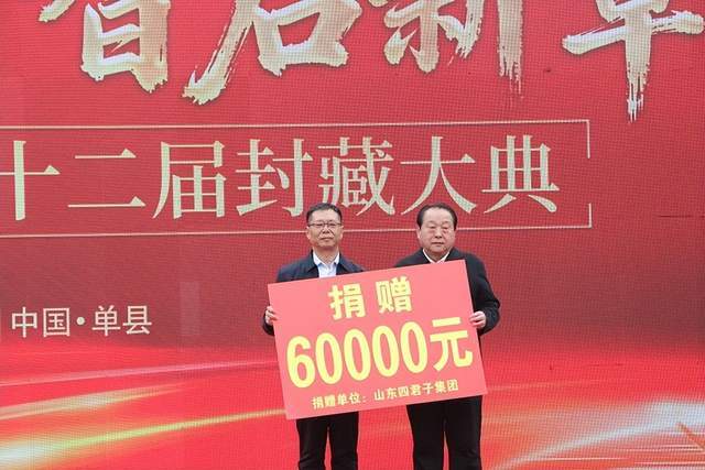 封藏大典活动现场,四君子集团还举行了隆重的储酒封坛仪式。同时,集团党委书记、董事长李新民将单县爱心人士认购洞藏酒所得善款6万元,捐赠给单县工商联,用于单县慈善公益事业。此外,四君子集团还特邀省内外表演艺术家,为封藏大典助兴,奉献了一场精彩的文艺演出。